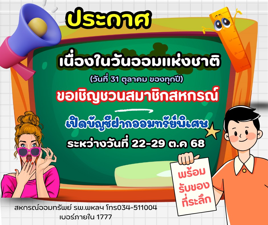 ขอเชิญชวนสมาชิกสหกรณ์ ที่ยังไม่มีบัญชีเงินฝากออมทรัพย์พิเศษ เปิดบัญชีขั้นต่ำเพียง 100 บาท เท่านั้น (ใช้เพียงสำเนาบัตรประจำตัวประชาชน)